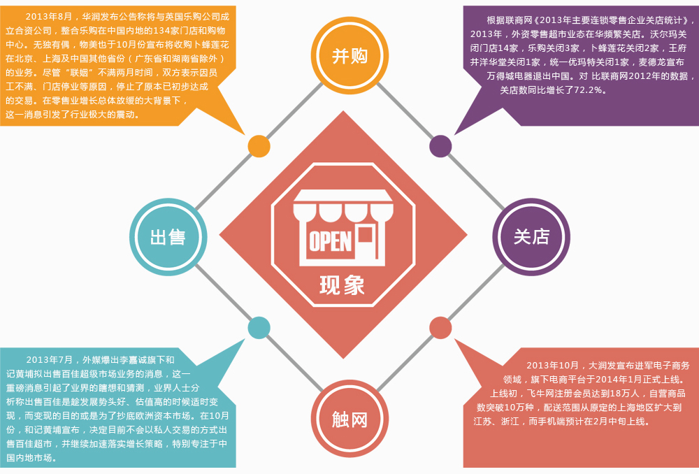 1995年,家樂福把第一家大賣場引進北京,隨后沃爾瑪、樂購、大潤發(fā)、樂天瑪特等外資超市開始攻城略地,搶占市場制高點。如今,外資超市在中國已經(jīng)走過了19年光陰。商業(yè)紅利不復存在,互聯(lián)網(wǎng)和大數(shù)據(jù)時代悄然來臨,電子商務(wù)兇猛來襲,本土黑馬超市迅速崛起。短兵相接的肉搏時代,無論是最早一批進入中國市場的家樂福沃爾瑪?shù)壤吓瞥校是尚在摸索的后起新秀,都必須以實力說話。