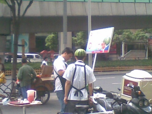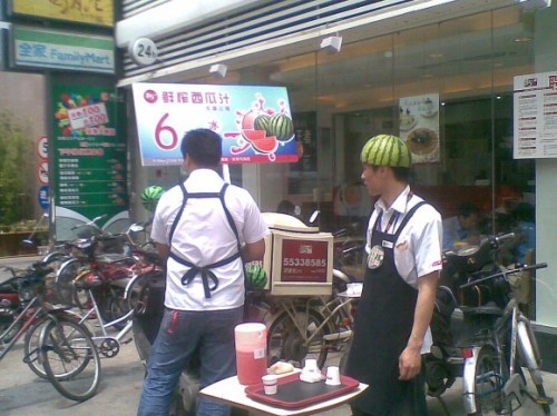 果然頂著真西瓜皮在店門口進(jìn)行 鮮西瓜汁免費(fèi)贈(zèng)飲呢!可愛的年輕人。