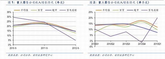 1) 2012年收入增速大幅放緩,且2013年一季度仍低位徘徊。其中2012年家電連鎖收入增速下滑幅度最大,2013年一季度增速反彈,而百貨和超市增速在10%左右;