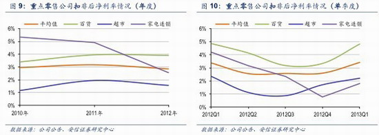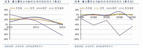 2) 在收入增長(zhǎng)大幅放緩,以及人工和租金上漲對(duì)業(yè)績(jī)的侵蝕下,2012年扣非后凈利增速大幅放緩,2013年一季度扣非后凈利負(fù)增長(zhǎng),其中百貨2012年實(shí)現(xiàn)正增長(zhǎng),超市和家電連鎖卻有所下滑;