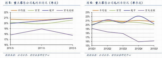 分業(yè)態(tài)來看,2012 年百貨和超市行業(yè)毛利率有所提升,家電連鎖毛利率大幅下滑。