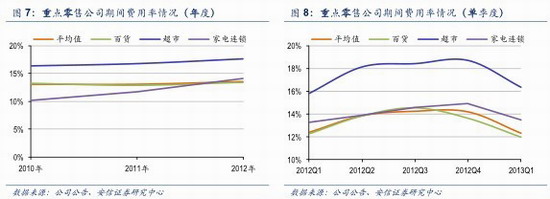 分業(yè)態(tài)來看,百貨、超市和家電連鎖的期間費(fèi)用率均有上升,其中家電連鎖最大。