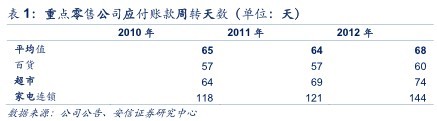 2012年重點(diǎn)零售公司的付現(xiàn)期略有提升,2012年應(yīng)付賬款周轉(zhuǎn)天數(shù)為68天,同比提高4天。其中百貨、超市行業(yè)略有提升,家電連鎖在較高水平上仍大幅提高。家電連鎖公司蘇寧云商2012年應(yīng)付賬款周轉(zhuǎn)天數(shù)為144天,同比提高23天。蘇寧云商的應(yīng)付賬款周轉(zhuǎn)天數(shù)遠(yuǎn)高于行業(yè)整體平均水平主要由于其全國(guó)范圍內(nèi)的連鎖渠道及規(guī)模優(yōu)勢(shì)的建立。
