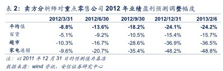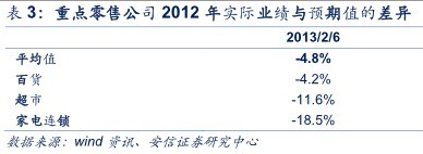 市場(chǎng)繼續(xù)對(duì)重點(diǎn)零售公司業(yè)績(jī)預(yù)測(cè)進(jìn)行下調(diào),至業(yè)績(jī)披露仍有一半公司業(yè)績(jī)低于市場(chǎng)一致預(yù)期。據(jù)wind統(tǒng)計(jì),相較2011年底,2012年底重點(diǎn)零售公司的業(yè)績(jī)預(yù)測(cè)平均下調(diào)了24.1%,而且處持續(xù)下調(diào)中。在對(duì)業(yè)績(jī)持續(xù)下調(diào)的背景下,重點(diǎn)零售公司2012年實(shí)際凈利比2013年2月6日(開始公布2012年年報(bào))預(yù)期下的業(yè)績(jī)?nèi)缘?.8%。其中,實(shí)際業(yè)績(jī)大幅低于2013年2月6日市場(chǎng)預(yù)期的有人人樂(-68.75%)、南京中商(-67.27%)和東百集團(tuán)(-58.79%)等;高于市場(chǎng)預(yù)期的有銀座股份(20.11%)和南京新百(10.03%)等。