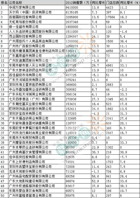 其中,廣州友誼集團(tuán)股份有限公司、百佳超級(jí)市場(chǎng)有限公司、深圳歲寶百貨有限公司、龍浩天地股份有限公司四家企業(yè)2012年業(yè)績下跌,人人樂連鎖商業(yè)集團(tuán)股份有限公司、中山市壹加壹商業(yè)連鎖有限公司、佳華百貨控股有限公司門店數(shù)減少,均負(fù)增長。
