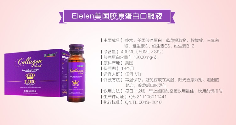膠原蛋白含量:每瓶50ml,含美國深海魚小分子膠原蛋白12000mg