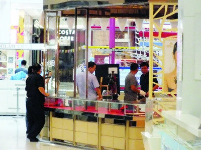 記者看到,在商場大門玻璃上貼有“商場設(shè)備檢修延遲開業(yè)”的字樣。大門內(nèi)有保安嚴密把守,只有民警和少數(shù)工作人員可以出入,F(xiàn)場數(shù)名員工告訴記者,商場賣黃金的專柜失竊,警察正在里面勘察現(xiàn)場,恐怕商場一時半會兒是不會營業(yè)的。記者從設(shè)置在商場大門附近的一處銀行取款機與商場之間的玻璃幕墻隔斷處看到,商場內(nèi)有很多警察,他們有的在靠近正門區(qū)域一處標有“XX珠寶”字樣的專柜前查看現(xiàn)場;有的圍聚在一起研究案情;還有一組民警在一家標有“中國黃金”字樣的專柜內(nèi)查看。幾名戴手套穿鞋套的民警仔細地尋找案件發(fā)生時留下的蛛絲馬跡。