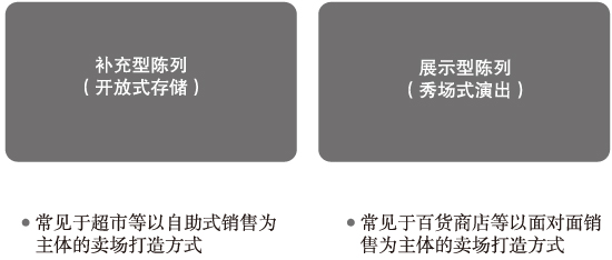 另外,也可以將陳列根據(jù)陳列工具的種類、陳列場(chǎng)所的特征以及銷售方法的不同加以分類。