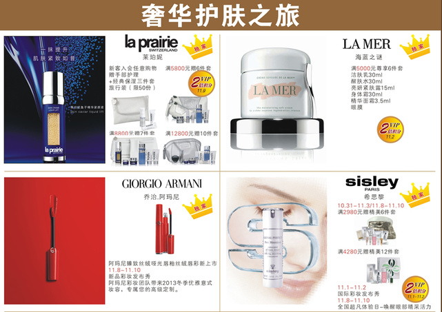 當(dāng)日在化妝區(qū)購滿5000元即可預(yù)約海藍(lán)之謎、赫蓮娜、希思黎、蘭蔻、肌膚之鑰60分鐘精致護(hù)理1次,每人限預(yù)約1次,每品牌限10位,約滿即止。