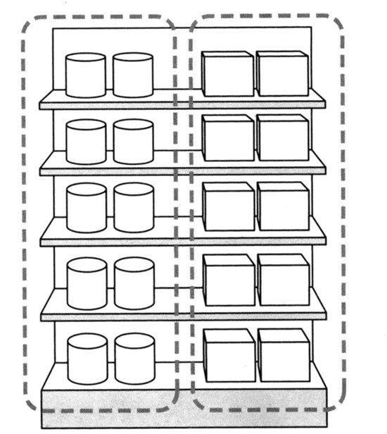 在縱向陳列中,將某商品線垂直對齊,在貨架上采用一定的幅度陳列商品,然后將關(guān)聯(lián)商品陳列在下一層貨架上。