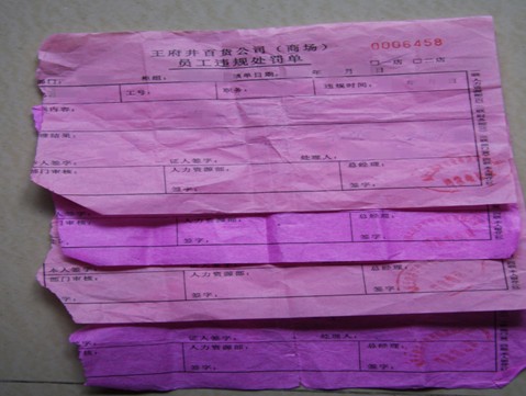 重慶王府井百貨職工罰款收據(jù)(經(jīng)要求做了技術處理)。