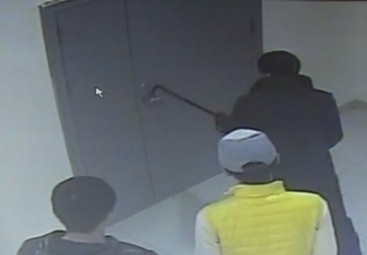 五分鐘之后,這伙人準(zhǔn)備離開。在出辦公室大門的時(shí)候,其中一位手持撬棒的人對大門又是一陣猛砸。