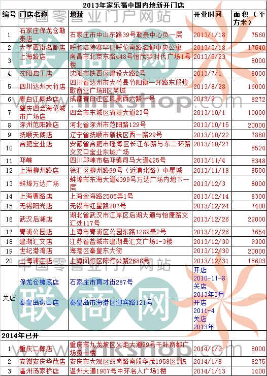 二、2013年家樂福中國內(nèi)地新開門店一覽(20家):