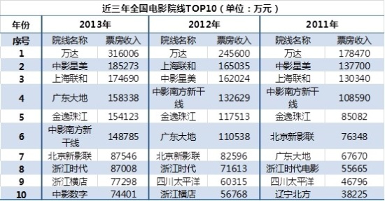 從近三年院線TOP10可以看出,萬達(dá)、中影星美和上海聯(lián)和始終占據(jù)前三;廣東大地和浙江橫店等民營院線成長迅猛,排名每年都在提升;北京新影聯(lián)和遼寧北方等老國企背景的院線成績雖也在增長,但增幅明顯小于其他院線,排名在逐年下降。各個(gè)院線的發(fā)展反映出極大的不平衡,有著雄厚資金背景支持的院線發(fā)展的扎實(shí)而迅速,2013年萬達(dá)院線票房已經(jīng)超過31億元,比第十名的中影數(shù)字高出4倍多!電影院線利益分配趨向于二八法則,未來幾年院線并購或?qū)⒊蔀橼厔荨?/p>