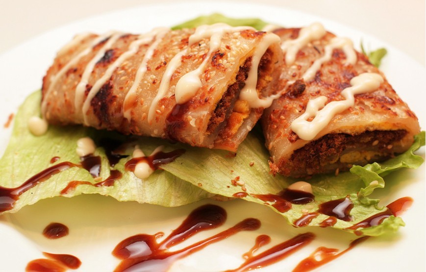 芙蓉蛋卷是正宗的成都特色小吃,外面包裹四張雪白的圓餅,里面包美味的鹵蛋和經(jīng)過精心炒制和調(diào)味的豆腐皮、素海螺、蔬菜等,