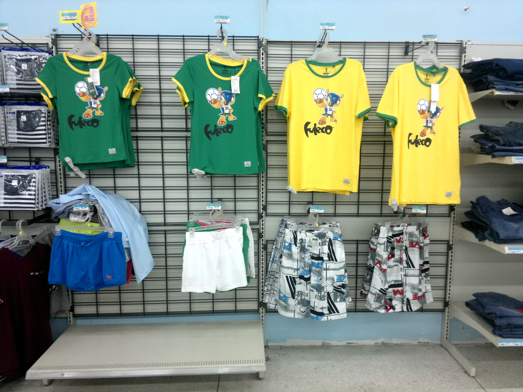這是沃爾瑪超市6月1日球主題體恤陳列區(qū),有38元和89元兩種,性價比非常高。滿足廣大追求物美價廉的球迷需求。
