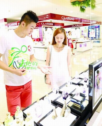 “男神”導(dǎo)購為女顧客推薦新款香水。