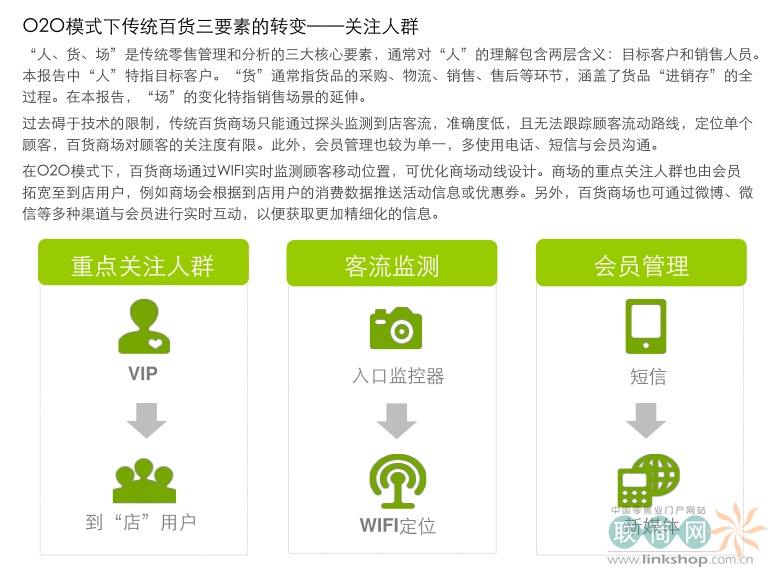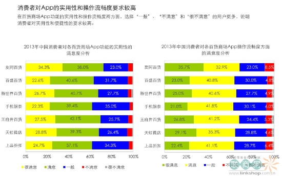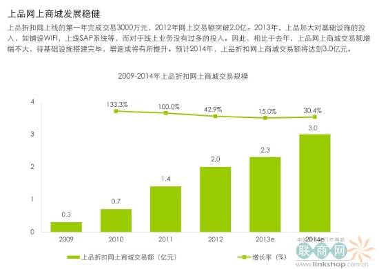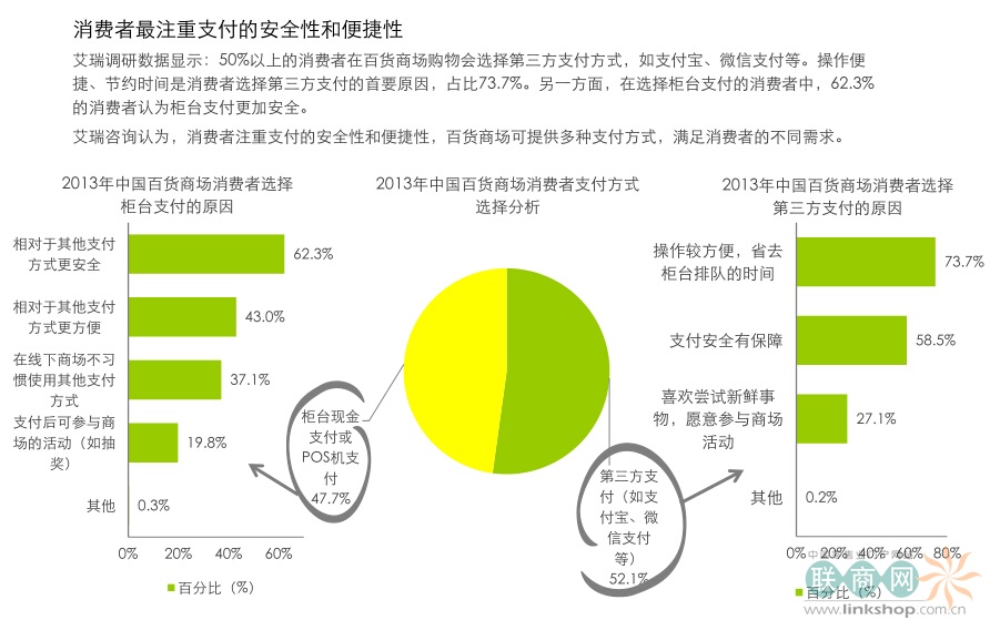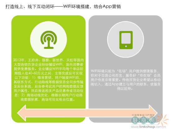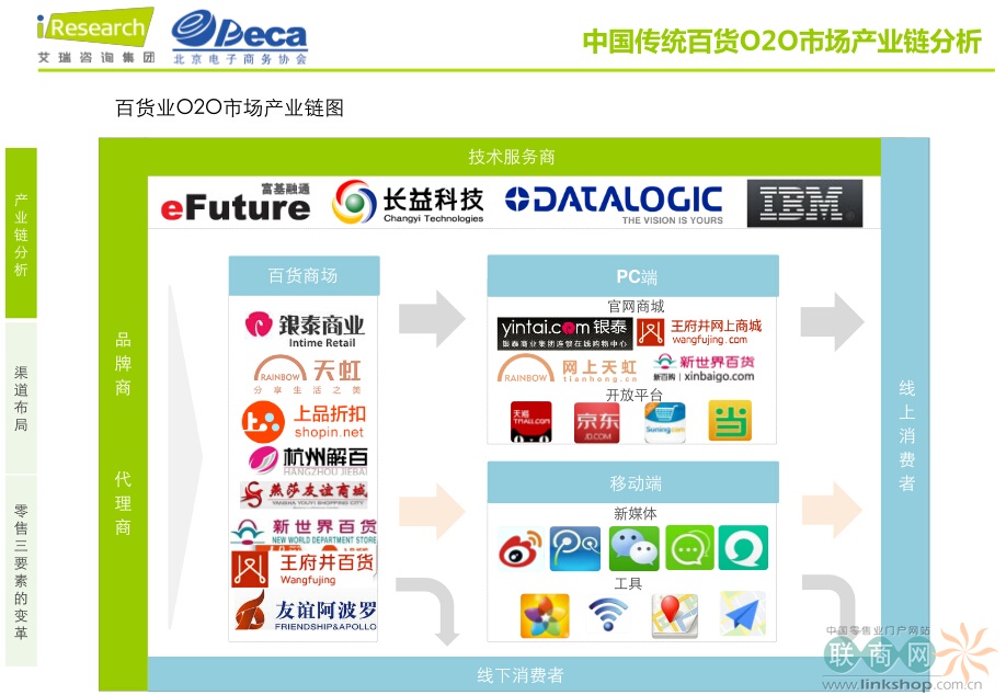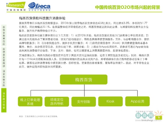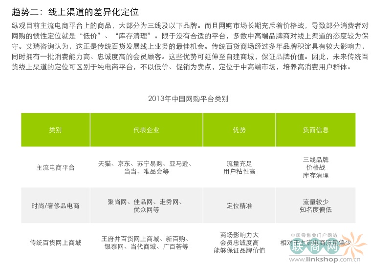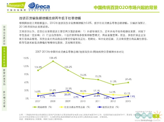 聯(lián)商網(wǎng)消息:7月23日,據(jù)艾瑞網(wǎng)發(fā)布的《2014年中國(guó)傳統(tǒng)百貨O2O市場(chǎng)及用戶(hù)研究報(bào)告》顯示,2013年中國(guó)連鎖百貨店商品銷(xiāo)售額達(dá)3508.7億元,增速放緩,占社會(huì)消費(fèi)品零售總額的比重降至1.5%。2013年中國(guó)連鎖百貨企業(yè)線(xiàn)上交易額達(dá)39.6億元,占連鎖百貨整體交易額的1.1%。2013年傳統(tǒng)連鎖百貨網(wǎng)上交易額占整體網(wǎng)購(gòu)市場(chǎng)交易規(guī)模的0.2%,傳統(tǒng)連鎖百貨官方網(wǎng)上商城銷(xiāo)售規(guī)模在整體B2C市場(chǎng)占比0.5%。