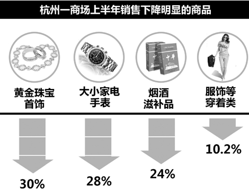 盡管浙江上半年社會消費品零售總額同比增長12.1%,但最近各大商場陸續(xù)出爐的期中考成績單,都不怎么漂亮,多家商場同比降幅達兩位數(shù),個別商場的實際降幅甚至高達30%左右。作為同行中的佼佼者,銀泰商業(yè)也不例外,今年截至6月30日,公司及其附屬公司的銀泰百貨店同店銷售總額72.18億元,同比降2.4%;武林銀泰下跌8.3%,浙江多家門店業(yè)績也大同小異,比如寧波天一店降15.2%,寧波東門店降13.2%,杭州銀泰西湖店降12.6%,銀泰臨平店降6.9%,金華銀泰城降4.8%。