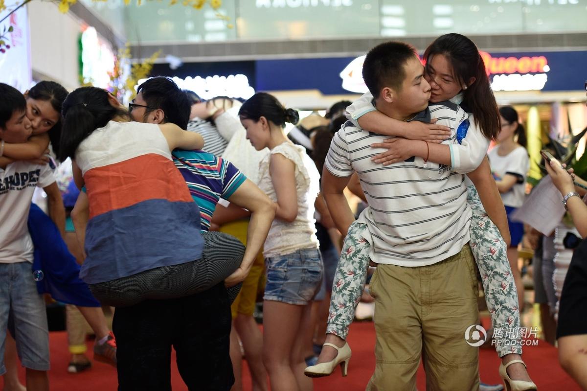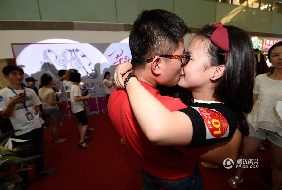 8月2日,江蘇省南京市, 農(nóng)歷7月初7是中國傳統(tǒng)的“情人節(jié)”,當晚,一場接吻大賽在南京八佰伴舉行,選手們通過多輪姿勢“技巧”的比拼爭奪鉆戒大獎,參賽的戀人們苦吻強撐,動作花樣百出,在七夕中國傳統(tǒng)情人節(jié)這一天,用KISS的方式大膽表達對愛人的真摯情義。