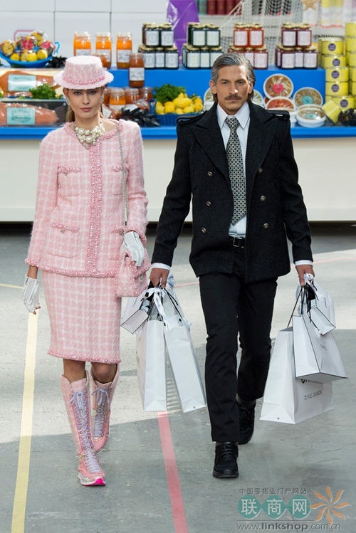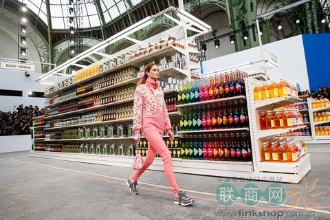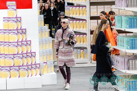 CHANEL設(shè)計(jì)師Karl Lagerfeld把巴黎大皇宮裝修成了大型超市的模樣,讓模特們?cè)诒炯镜陌屠钑r(shí)裝周上一邊購(gòu)物一邊走秀