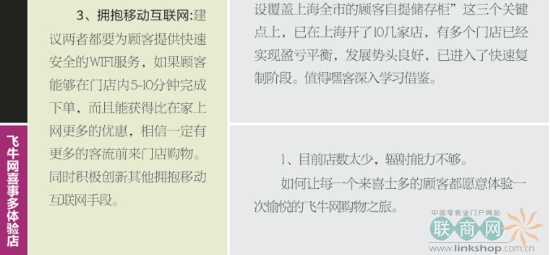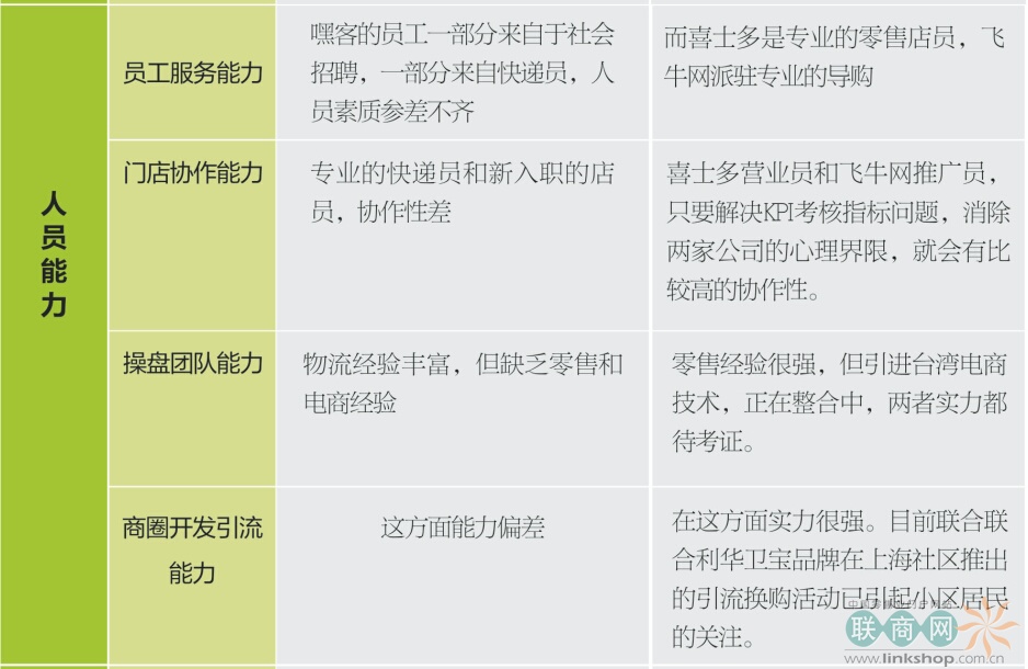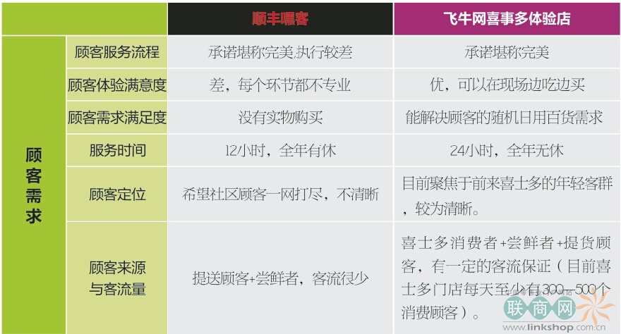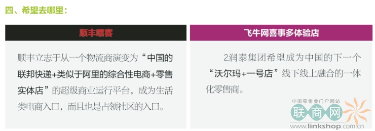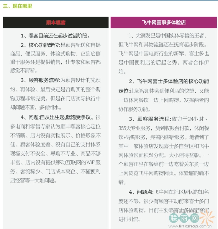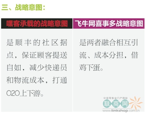 筆者特意去體驗了上海多家順豐嘿客和飛牛網(wǎng)喜士多體驗店。發(fā)現(xiàn)他們的前生不同,企業(yè)DNA不同,戰(zhàn)略意圖不同,定位不同,功能不同,目標(biāo)不同,實現(xiàn)目標(biāo)的能力也不盡相同,都面臨著巨大的挑戰(zhàn)。筆者認(rèn)為在短期內(nèi)飛牛網(wǎng)喜士多體驗店更容易取得成功,而順豐嘿客還在積極的探索試錯模式中,未可定論。