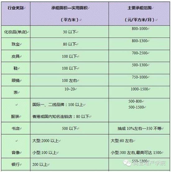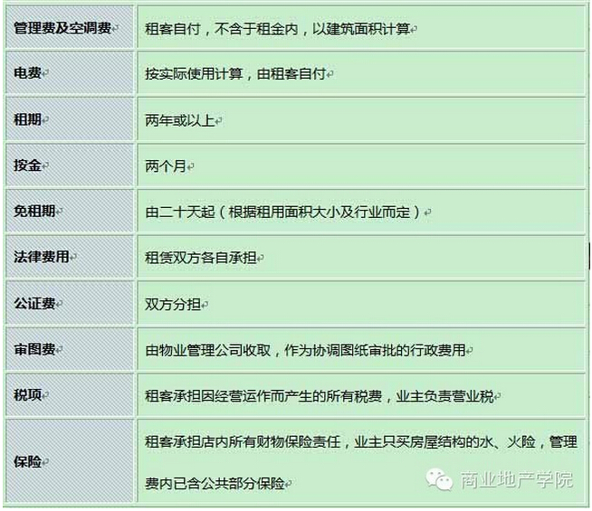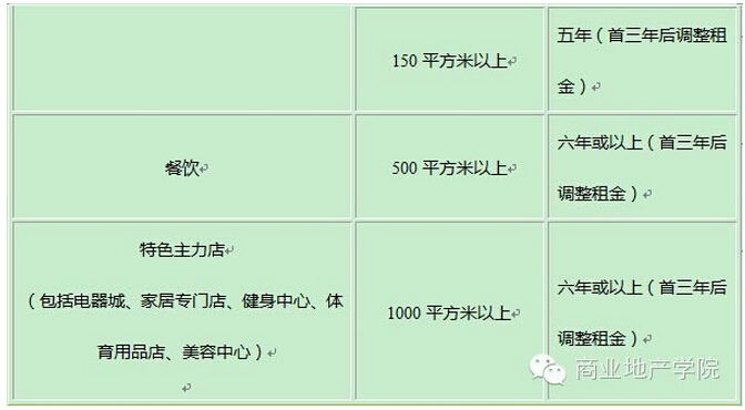由于各行業(yè)的經(jīng)營手法及投入資金不同,租約期及裝修期亦有很大的差別,具體內(nèi)容見下表: