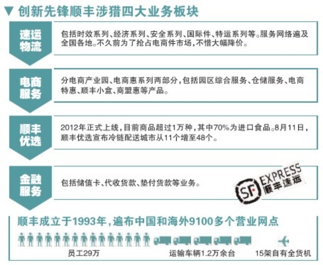 如今的順豐已成為一個涵蓋四大業(yè)務板塊的商業(yè)帝國。截至7月,順豐已擁有近30萬名員工,1.2萬多臺運輸車輛,15架自有全貨機及遍布中國內(nèi)地、海外的9100多個營業(yè)網(wǎng)點。
