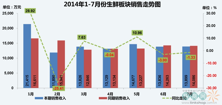 聯(lián)商網消息:上海市浦東新區(qū)商業(yè)信息中心對9個品牌的大賣場、超市樣本企業(yè)(共計29個樣本監(jiān)測點)監(jiān)測數據顯示,經營方面:7月份實現(xiàn)銷售收入5.77億元、同比下降5.19%、環(huán)比增長1.24%。多數企業(yè)預測由于受到網絡購物、今年夏季雨水較多和取消家電補貼等政策的持續(xù)影響,下半年經營狀況以持平為主。各板塊方面:食品板塊同比下降2.25%、生鮮板塊同比下降1.33%、非食板塊業(yè)績大幅下滑超10%。具體情況如下: