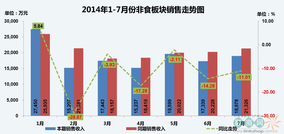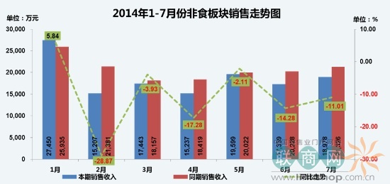7月的網購活動對大賣場、超市的非食板塊實現(xiàn)業(yè)績增長帶來很大困難,如某電商品牌持續(xù)一個月的周年慶,每日都有特惠專場、大量商品5折起售。為了應對網絡購物,不少大賣場、超市建立的自有電商也開始搶占這塊市場份額,這對實體店面的業(yè)績再次造成巨大沖擊。據統(tǒng)計,7月份非食板塊銷售收入1.56億元、同比下滑8.38%、環(huán)比增長28.46%。