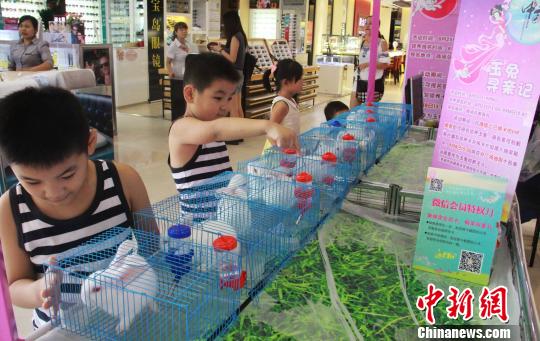 8月28日,幾位兒童正在商場觀看“玉兔”。面對即將到來的中秋佳節(jié),湖南長沙一商場當(dāng)天上演了一場“玉兔尋親記”,以買商品積分送“玉兔”的形式,迎接這個傳統(tǒng)佳節(jié)。 。ㄖ行律 唐小晴 攝)