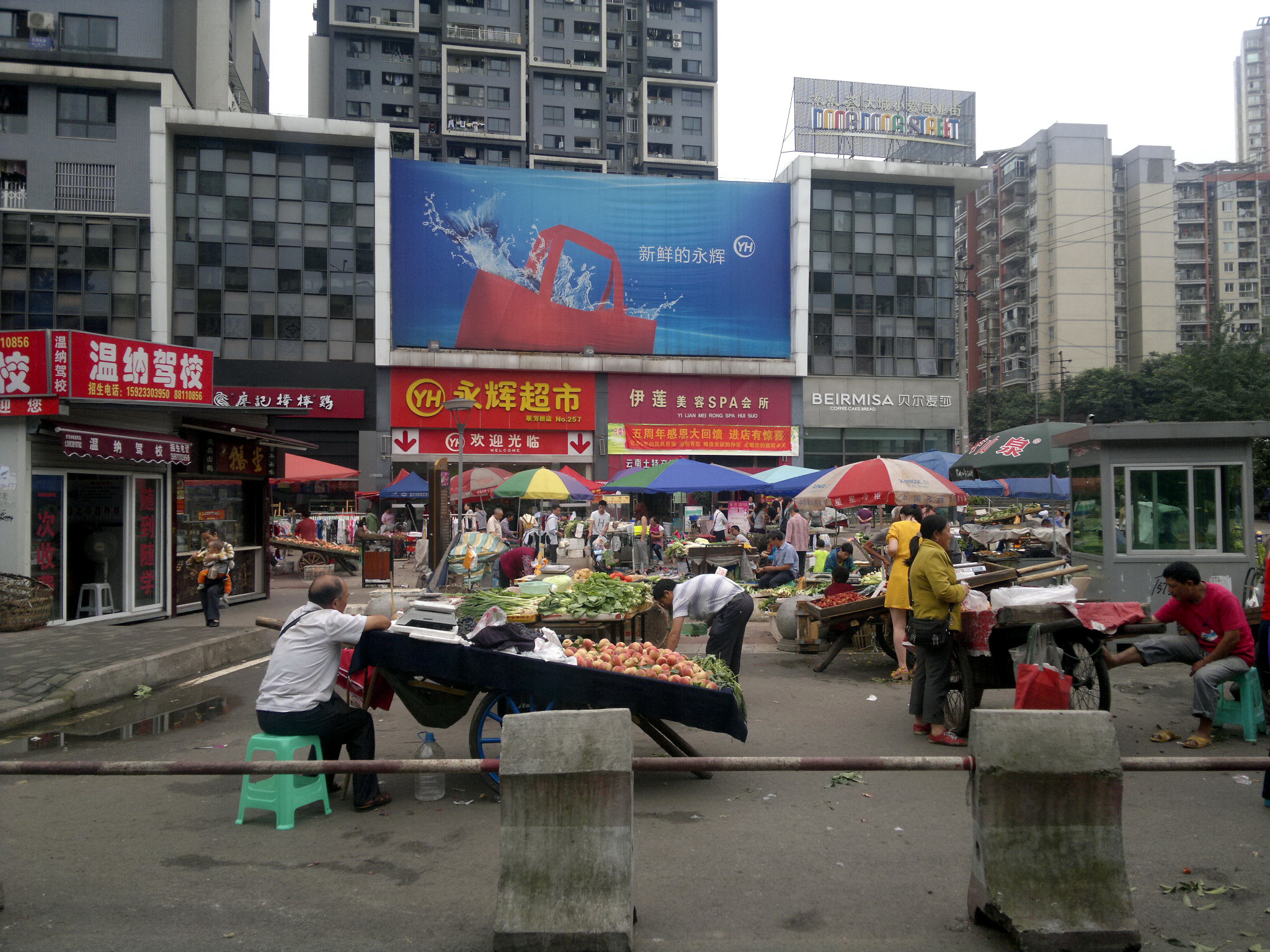 這是重慶市區(qū)聯(lián)芳橋的永輝超市,永輝是公認(rèn)的生鮮最強(qiáng)的大型連鎖超市,但是它門(mén)口的小區(qū)廣場(chǎng)和旁邊的街道依然自發(fā)形成了一個(gè)占道的農(nóng)貿(mào)生鮮市場(chǎng)。