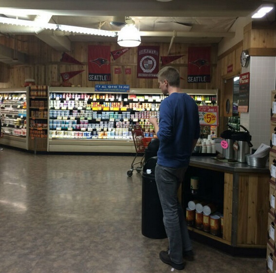 DAVE介紹,因為門店在華盛頓大學旁,社區(qū)中年輕的消費者較多,家庭比較少。該商圈有個湖,門店軟裝部分都圍繞著湖的題材做設計,例如靠墻貨架的墻面的畫取自湖的風景,價格標簽也有穿著可愛的外套的魚,貨架頂端有一些船模型的道具等。