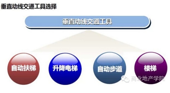 垂直人流動(dòng)線:室內(nèi)垂直交通系統(tǒng)對(duì)購物中心內(nèi)部人流的引導(dǎo)起到關(guān)鍵的作用,將直接對(duì)購物中心的經(jīng)營(yíng)產(chǎn)生影響。垂直動(dòng)線交通工具主要分為自動(dòng)扶梯、自動(dòng)步道、電梯、樓梯4個(gè)形式。