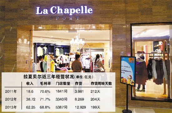 對于正處于上升趨勢的拉夏貝爾來說,營收和凈利高速增長的光芒掩蓋了庫存增加的隱憂。其近三年的收入及利潤增長率都頗為可觀,收入由2011年度的18.6億元增加至2012年度的38.72億元、2013年度的62.25億元,年復(fù)合增長率為82.7%。凈利潤由2011年度的1.23億元增加至2012年度的2.6億元、2013年度的4.13億元,年復(fù)合增長率為83.3%。