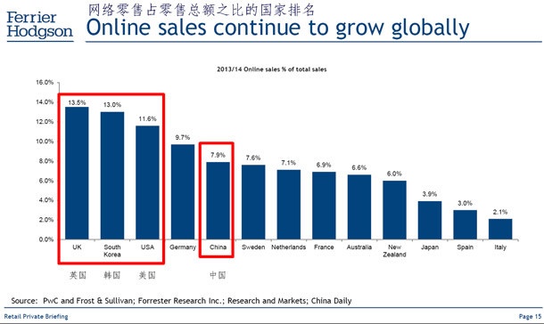 2、線上銷(xiāo)售的發(fā)展畢竟還是有限高的。馬王之賭在國(guó)內(nèi)引出了這個(gè)熱議的話題,但是稍有零售專(zhuān)業(yè)背景和商業(yè)大局觀的人都明白線上的銷(xiāo)售將取代線下銷(xiāo)售達(dá)50%是完全不可能的,永遠(yuǎn)也達(dá)不到這個(gè)比例。看一下互聯(lián)網(wǎng)發(fā)達(dá)和成熟的國(guó)家,盡管這些年線上銷(xiāo)售的增長(zhǎng)也很快,但占零售總額比例也就百分之十幾而已。