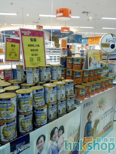 孩子王里的各個(gè)專(zhuān)柜門(mén)前都放了各自活動(dòng),孩子的“吃、穿、用”統(tǒng)統(tǒng)都在搞活動(dòng):巴布豆、南極人、憶嘉貝貝、雀巢、嘉寶、美贊臣等等。