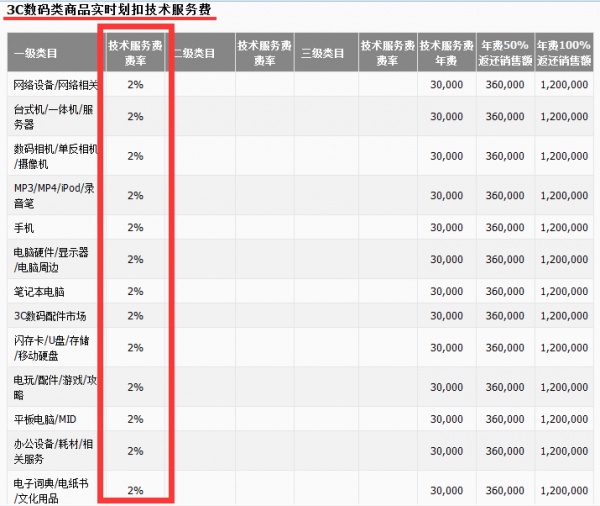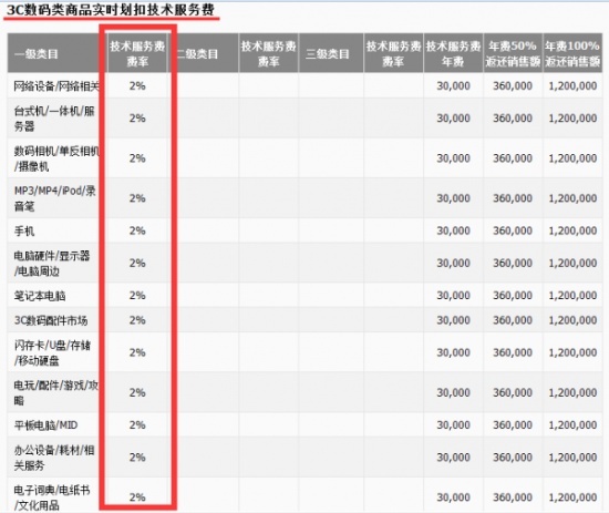 圖片上是天貓向公眾公布的資費(fèi)標(biāo)準(zhǔn)。分析圖片2的3W數(shù)碼類商品收費(fèi)標(biāo)準(zhǔn),拋開(kāi)起價(jià)高昂的保證金之外,每年必須向天貓上交的3萬(wàn)元技術(shù)服務(wù)費(fèi)年費(fèi),只有當(dāng)?shù)赇佷N售量突破36萬(wàn)元甚至是120萬(wàn)元,才會(huì)退換年費(fèi)的50%或100%。此外2%的實(shí)時(shí)劃扣技術(shù)服務(wù)費(fèi),店主們稱其為“天貓扣點(diǎn)”:店鋪內(nèi)任何一筆交易的成交金額的2%(不包含郵費(fèi)),會(huì)自動(dòng)劃扣給天貓。整個(gè)天貓的收費(fèi)體系,可以說(shuō)構(gòu)成了阿里公司營(yíng)收的半壁江山。
