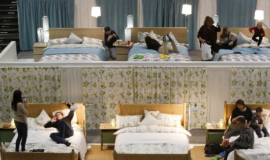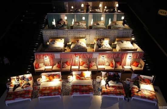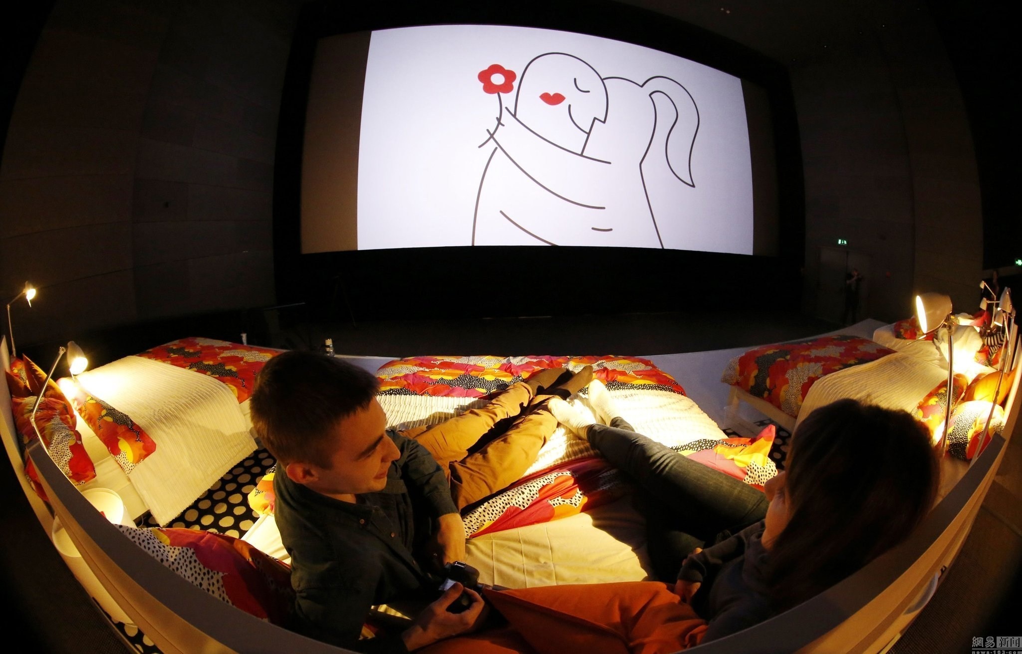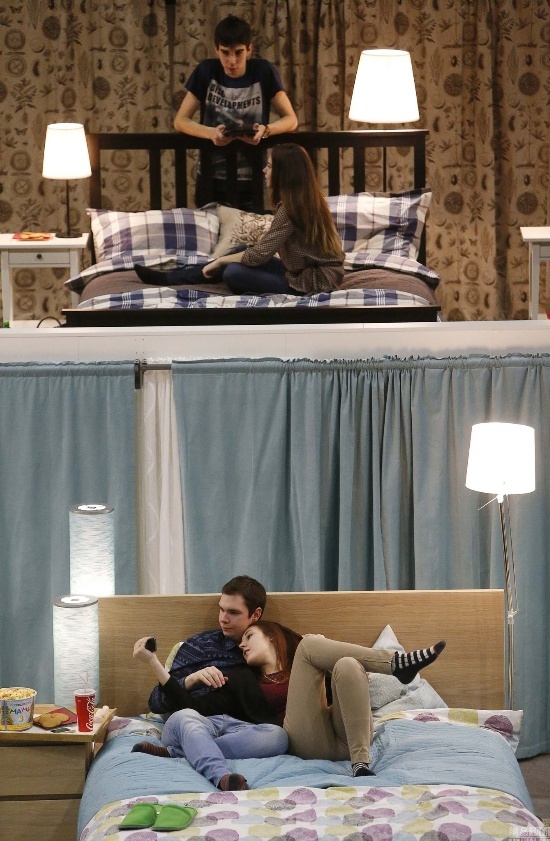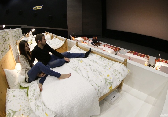 當(dāng)?shù)貢r間2014年12月7日,俄羅斯莫斯科郊區(qū)希姆基,家具零售商宜家將一處電影院內(nèi)的座椅全部更換為宜家家居,17張雙人床讓觀眾可以躺著觀看電影。電影院的名字也被更換為“喚醒愛”。