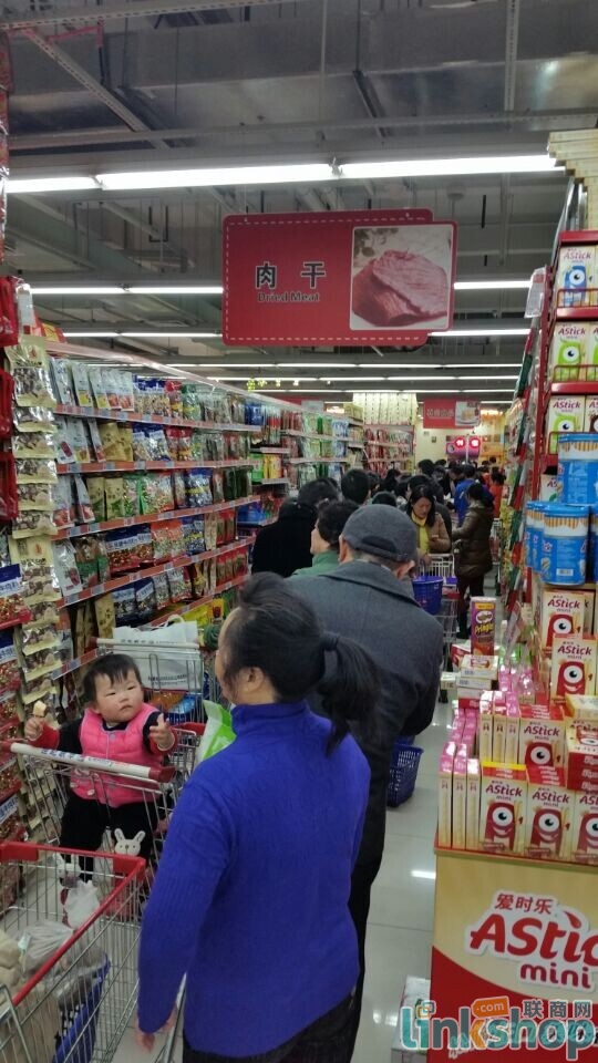聯(lián)商網(wǎng)記者來(lái)到位于杭州濱江的世紀(jì)聯(lián)華江暉店,雖然早有心理準(zhǔn)備,但還是被火爆的場(chǎng)面驚呆了。整個(gè)賣場(chǎng)內(nèi)人滿為患,20多個(gè)收銀臺(tái)都排起了長(zhǎng)隊(duì),每個(gè)隊(duì)伍足有20米長(zhǎng),多數(shù)人準(zhǔn)備用支付寶進(jìn)行支付,包括部分年紀(jì)偏大的中老年人。記者目測(cè),在消費(fèi)者所購(gòu)商品中,大米、食用油、日用品及食品比重相對(duì)較大。據(jù)了解,排隊(duì)完成支付大約需要1個(gè)半小時(shí)左右。