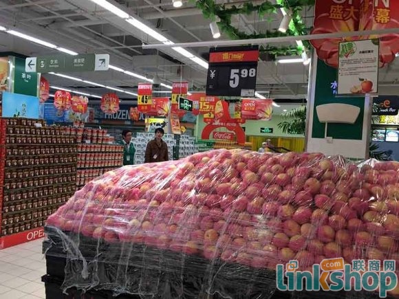 水果區(qū)蘋(píng)果被碼放得整整齊齊,覆蓋其上的保護(hù)膜正等待著第二天一早被揭開(kāi)。