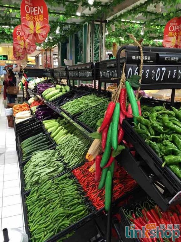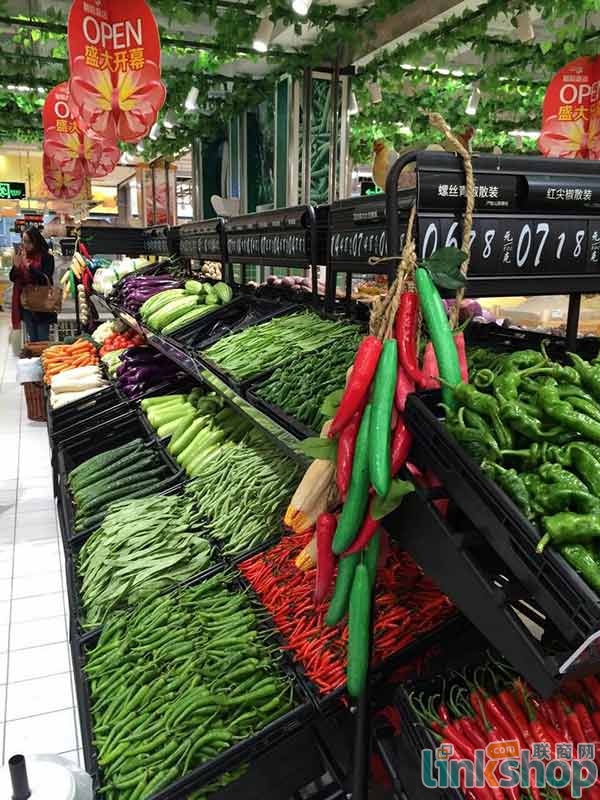 開(kāi)業(yè)前晚,超市蔬果區(qū),貨品被碼放得整整齊齊。
