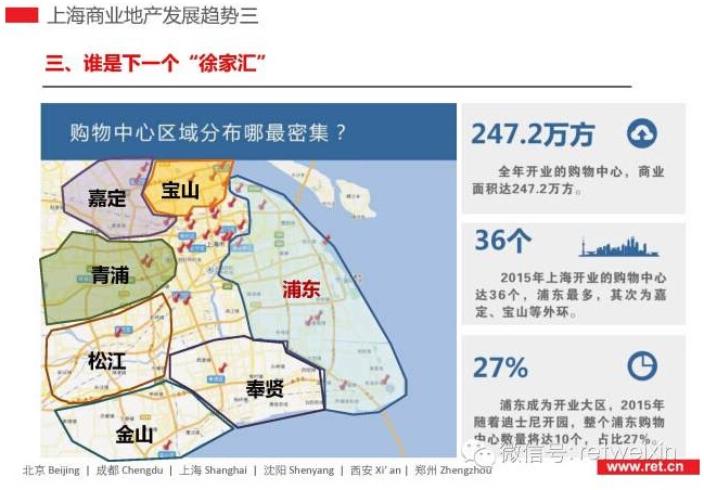 RET睿意德分析指出,2014年,上海購物中心進入調(diào)整年,已開業(yè)的112家購物中心,40家已經(jīng)或計劃升級;大型高端餐飲開始撤離購物中心,中小型大眾餐飲取而代之;上海是中國最“甜”的城市,也是買手店最活躍的城市,在上海的購物中心中,參與性、戲劇性、儀式感正在逐漸加強;23個新興板塊中,浦東邊郊發(fā)展?jié)摿ψ畲,寶山、青浦緊隨其后,他們最有可能成為下一個“徐家匯”;隨著信貸資產(chǎn)證券化業(yè)務(wù)由審批制改為業(yè)務(wù)備案制,多元化的金融手段將為商業(yè)地產(chǎn)提供新的融資渠道和退出機制,中國商業(yè)地產(chǎn)金融驅(qū)動的模式將在未來兩到三年成為主流。