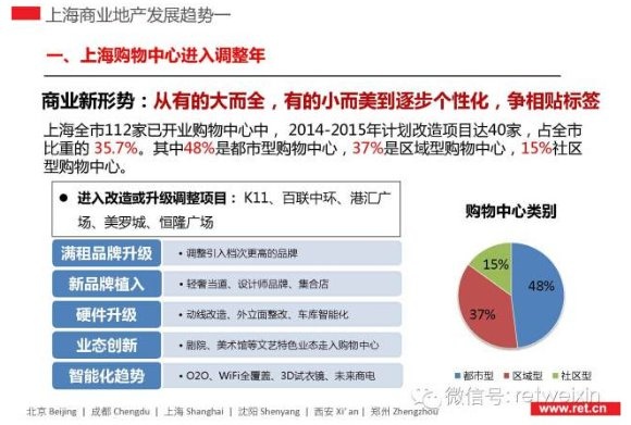 根據(jù)RET睿意德中國商業(yè)地產(chǎn)研究中心統(tǒng)計,在上海112家已開業(yè)的購物中心中,2014-2015年已經(jīng)或計劃改造的項目達40家,占全市比重的 35.7%。40家調(diào)整的購物中心中,48%是都市型購物中心,37%是區(qū)域型,15%是社區(qū)型。港匯廣場、美羅城、正大廣場、來福士等知名購物中心2014年都在進行大面積的改造升級,調(diào)整引入檔次更高的品牌或者具有特色的設(shè)計師集合店,改造動線、車庫,引進劇院、美術(shù)館特色業(yè)態(tài)等。
