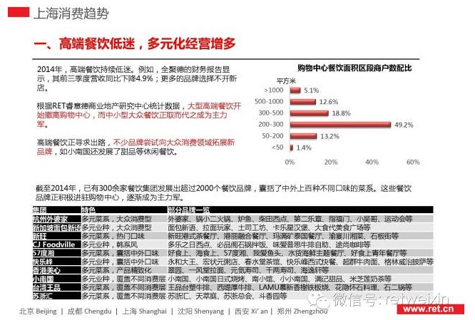 中小型大眾餐飲取而代之。2014年,高端餐飲持續(xù)低迷。根據(jù)RET睿意德中國商業(yè)地產(chǎn)研究中心統(tǒng)計數(shù)據(jù),大型高端餐飲開始撤離購物中心,而中小型大眾餐飲正取而代之成為主力軍。而高端餐飲正尋求出路,不少品牌嘗試向大眾消費領(lǐng)域拓展新品牌,截至2014年,已有300余家餐飲集團發(fā)展出超過2000個餐飲品牌,如小南國還發(fā)展了甜品等休閑餐飲。