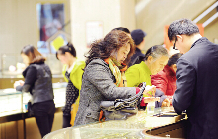 昨日,在友阿黃金國(guó)貨陳列館店,市民在選購(gòu)黃金。鄒麟 攝
