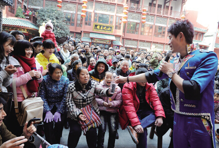 昨日,長(zhǎng)沙火宮殿廟會(huì)人氣旺,游人邊品小吃邊看表演,其樂融觸。余志雄 攝