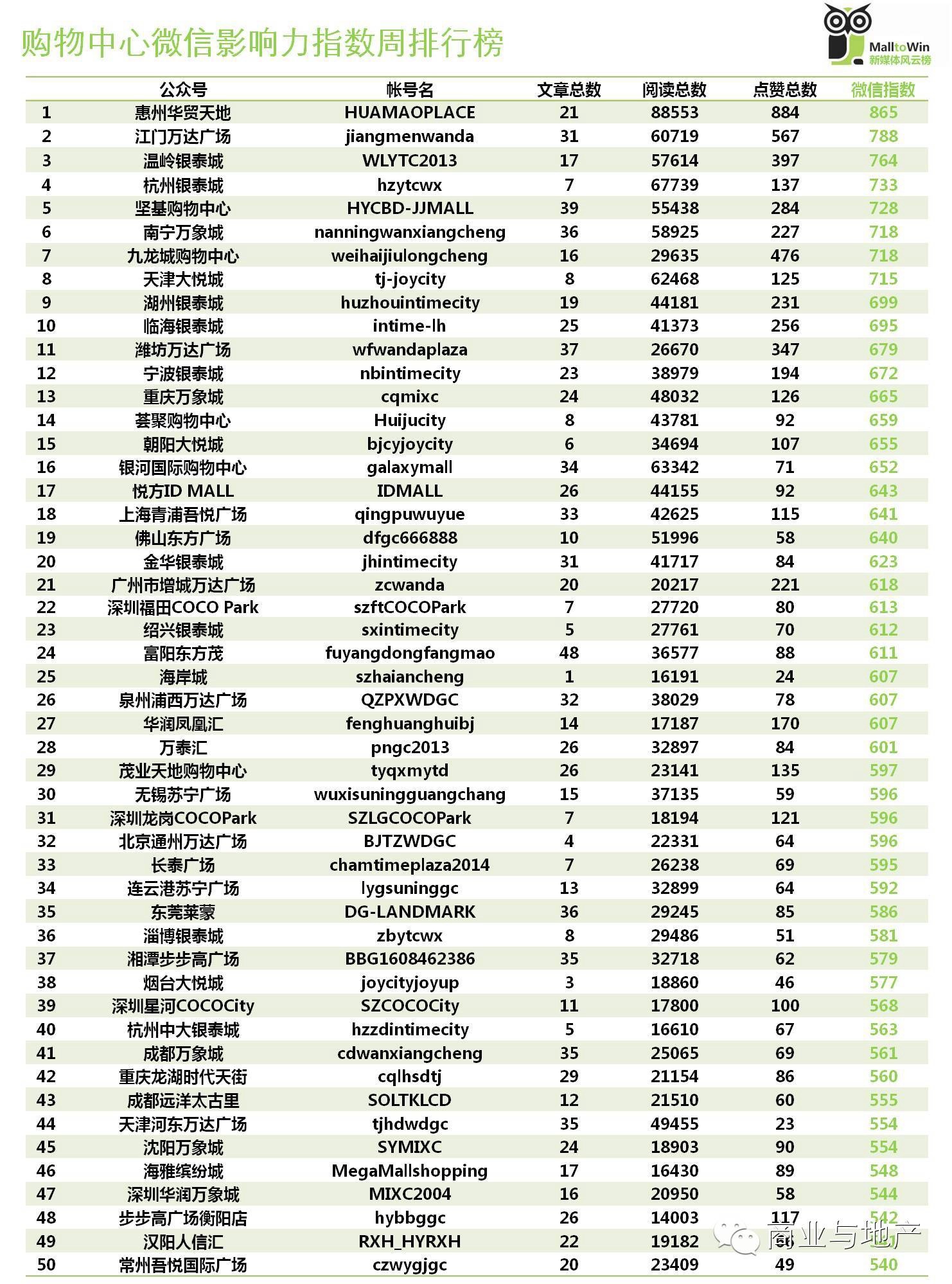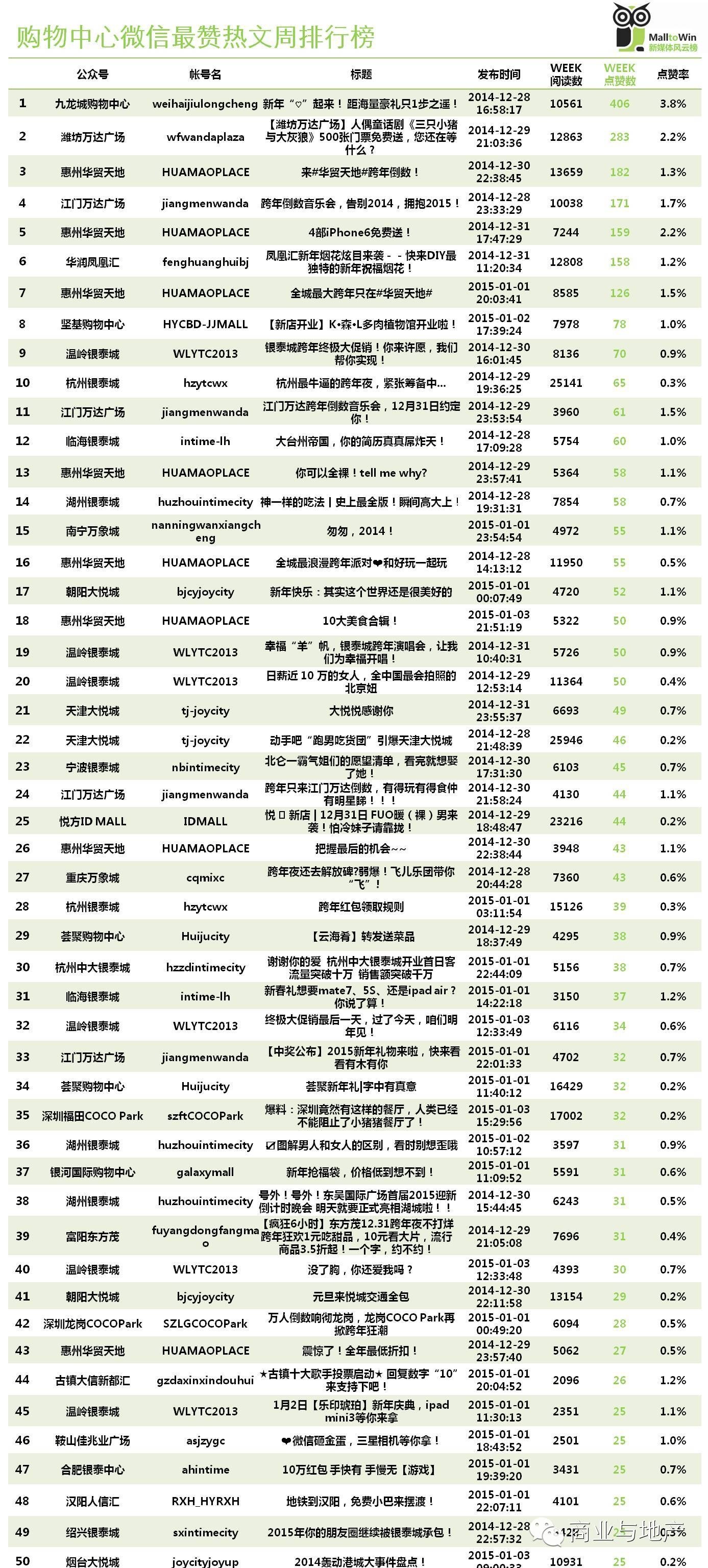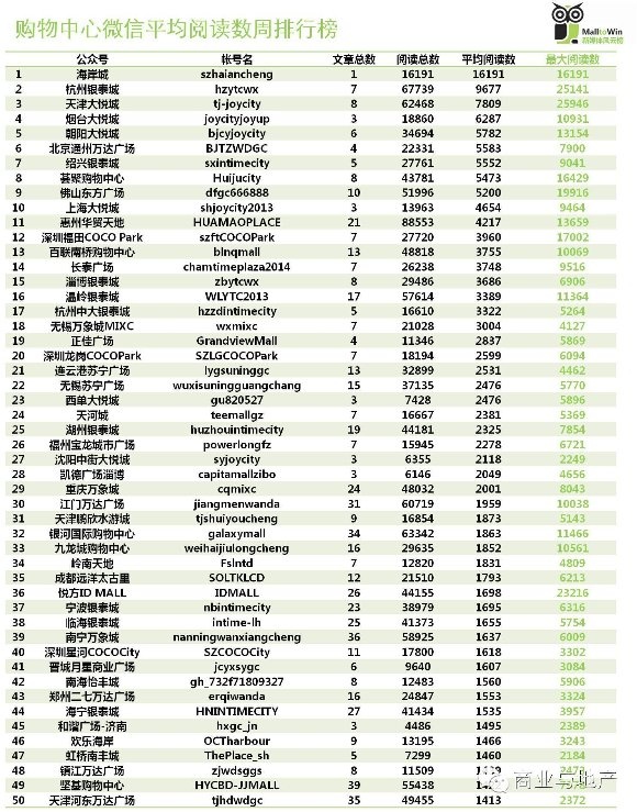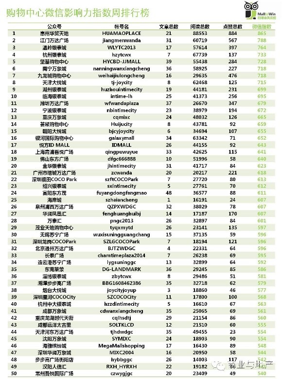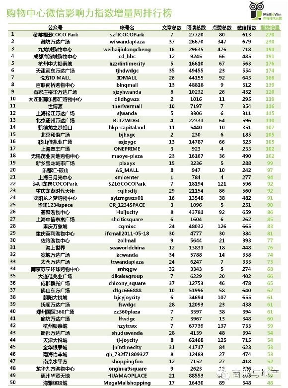 主題:【數(shù)據(jù)】購物中心微信影響力周TOP50排行榜