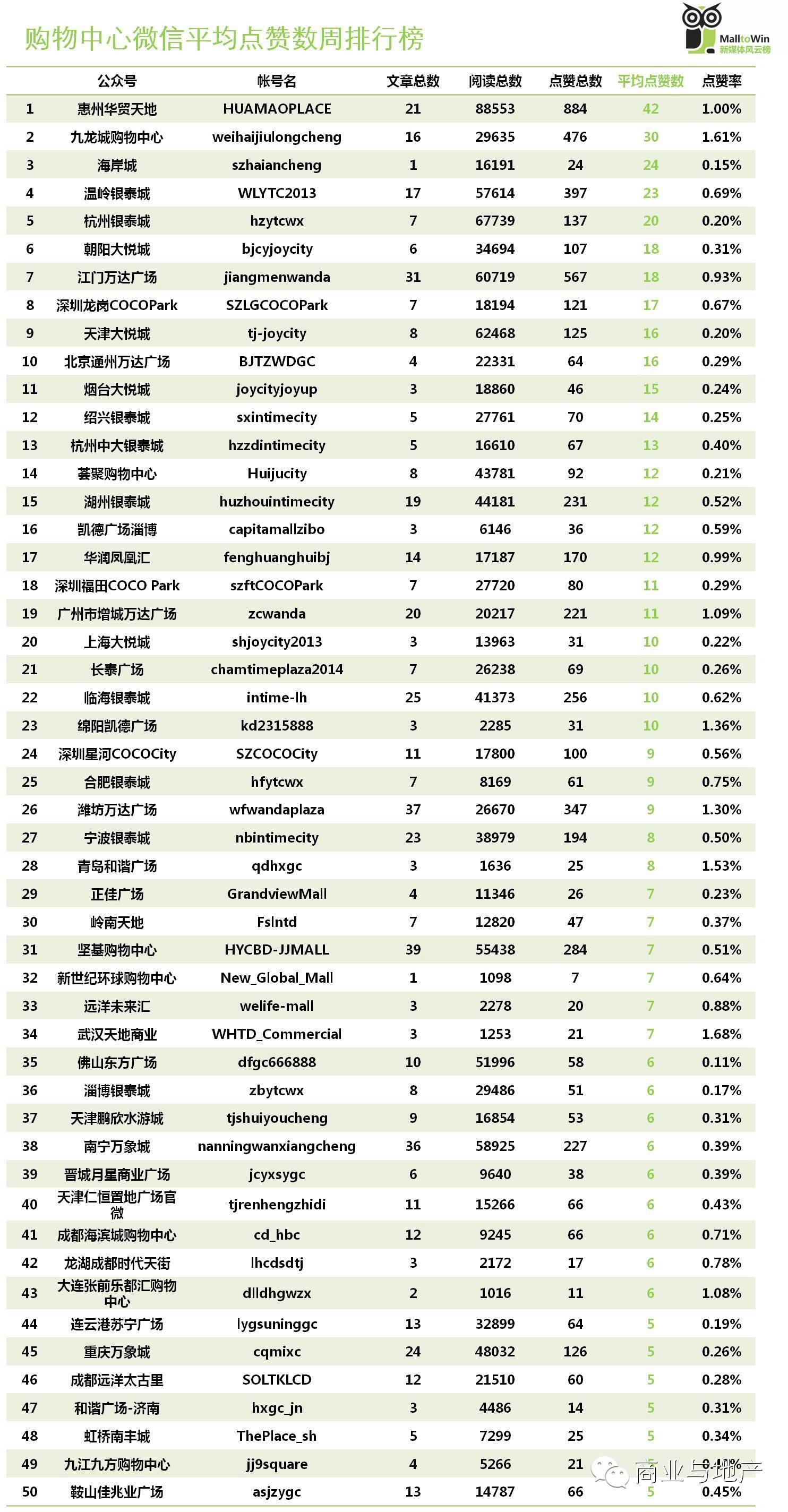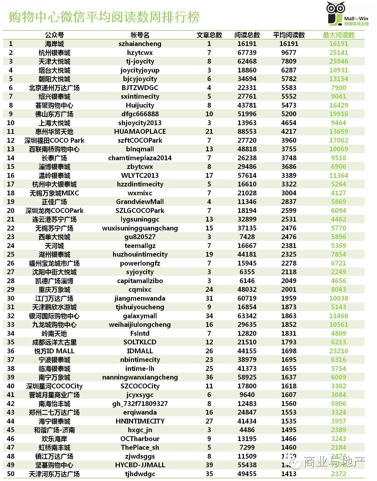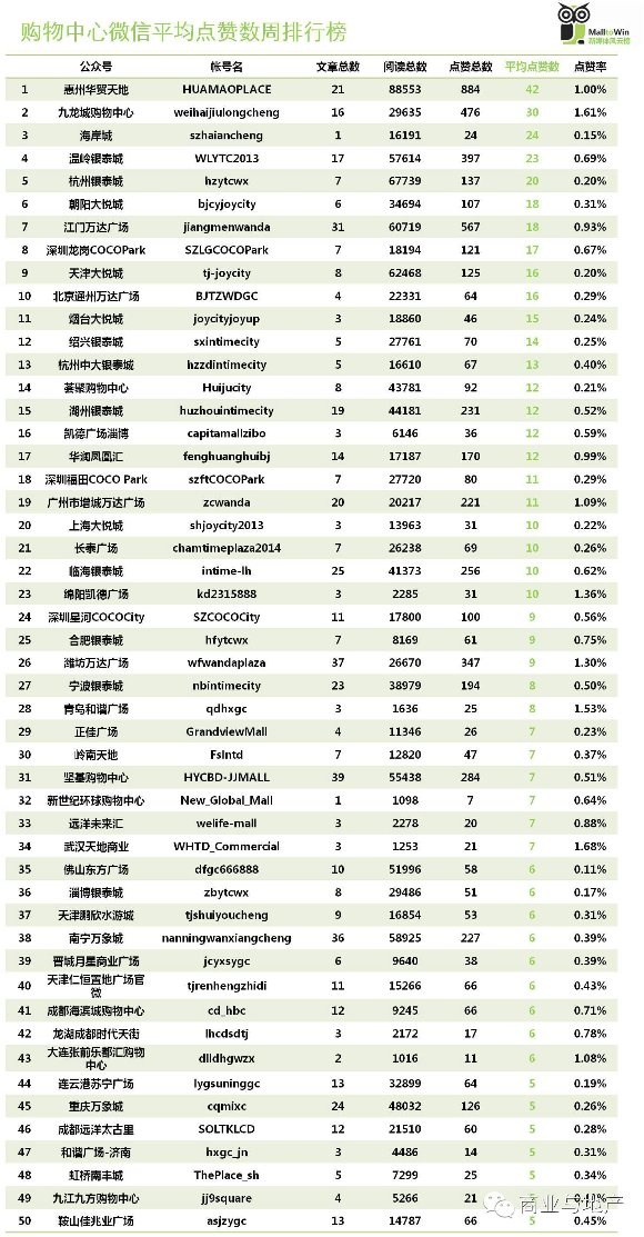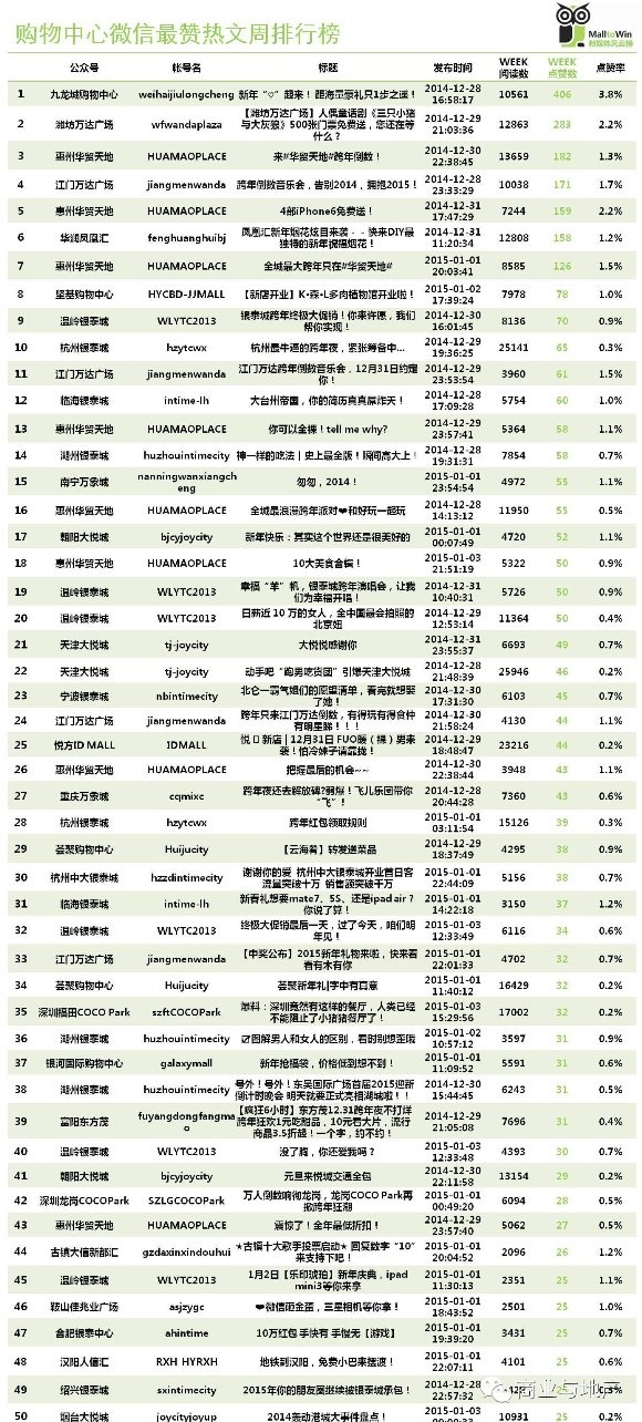 主題:【數(shù)據(jù)】購物中心微信影響力周TOP50排行榜