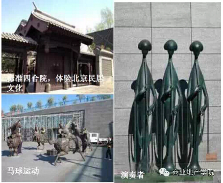 作為緊接商業(yè)的下沉廣場(chǎng),從南向北走,全長(zhǎng)七百米,最窄40米,最寬110米,由七種不同風(fēng)格的院落組成,通過(guò)雕塑與小品等形式,不僅完美的展現(xiàn)了中國(guó)古代及北京特色的文化,同時(shí)也達(dá)到了很好的吸引人流的效果,實(shí)現(xiàn)了文化與商業(yè)的有效結(jié)合。
